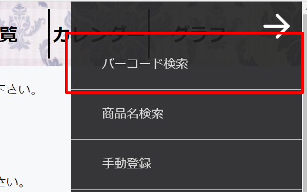 右上の≡から「バーコード検索」を選択下さい。