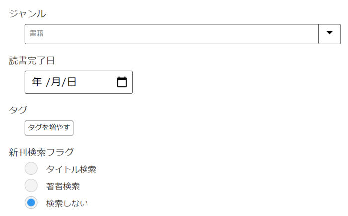書籍連続登録オプションには、読書完了日やタグ等を選択できます。ご自由にお使いください。